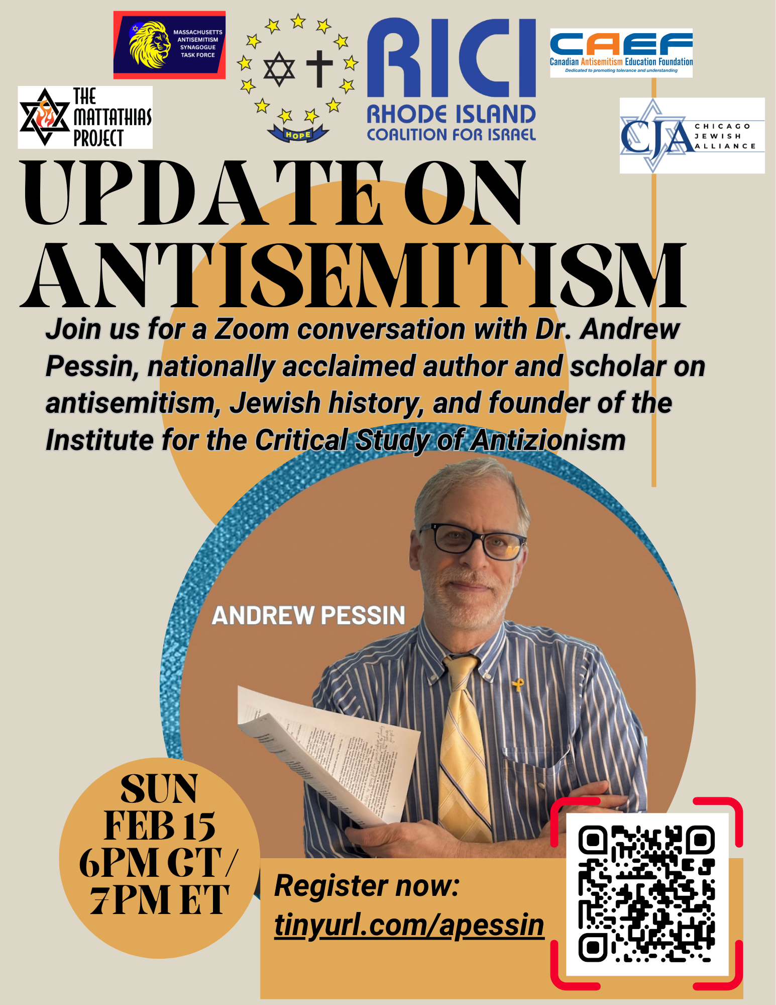 The Chicago Jewish Alliance invites you to join the Rhode Island Coalition for Israel (RICI) for an important update on antisemitism featuring nationally acclaimed author and expert Dr. Andrew Pessin. This event is presented in collaboration with the Massachusetts Antisemitism Synagogue Task Force, Canadian Antisemitism Education Foundation, and The Mattathias Project.
